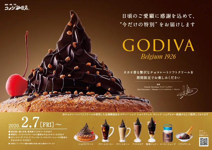 ゴディバジャパン社 シェフ ショコラティエ/パティシエ ヤニック・シュヴォロ―氏が監修したショコラノワールなど8種の商品を数量限定で販売いたします。日頃のご愛顧に感謝の気持ちを込めて、コメダから“今だけの特別”をお届けします。