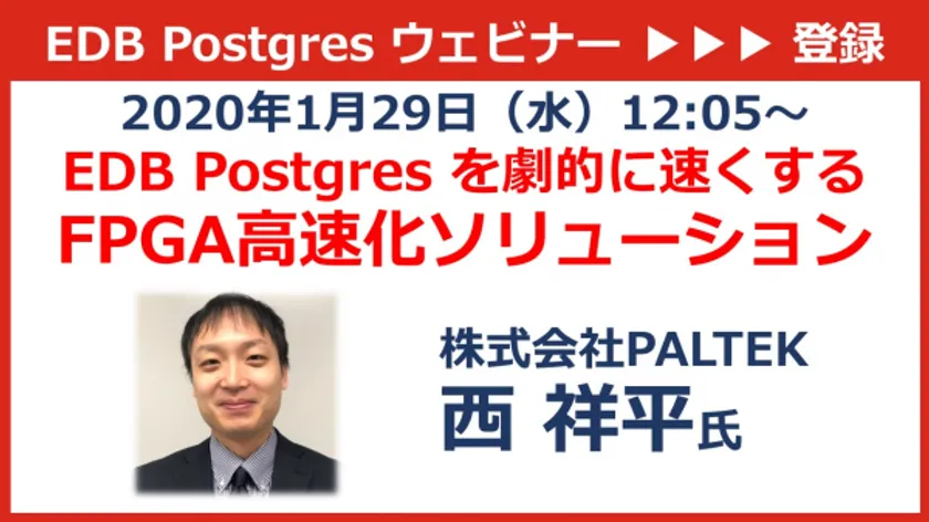 株式会社PALTEK(本社:横浜市港北区、代表取締役社長:矢吹 尚秀、証券コード:7587、以下 PALTEK)は、2020年1月29日(水)にエンタープライズDB株式会社(本社:東京都新宿区、代表取締役:藤田 祐治)と共同で、WEBセミナーを実施します。
