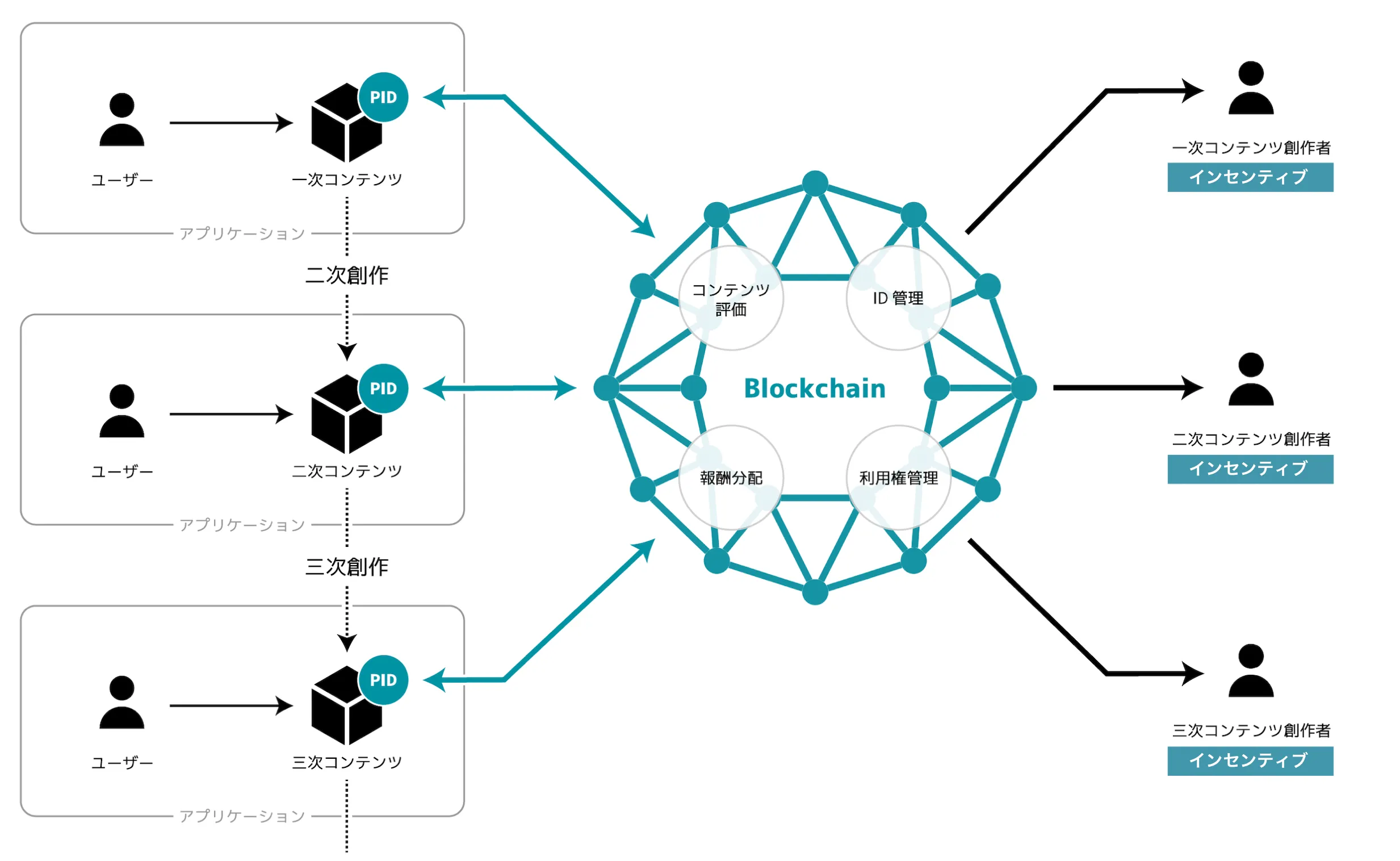 現在、ニュース、漫画やアニメといったコンテンツでは、著作権が認められるのは基本的に作者などの原著作者(一次創作にかかる権利)のみであり、あるコンテンツを元に別の新たなコンテンツを創作する「n次創作」に関する権利は認められていません。一方、n次創作によって、一次創作流通時を超えた新規ユーザの呼び込みがなされ、ユーザ層の拡大に貢献するケースも増えています。しかし、現状の著作権や流通システムではこれらを正しく評価する仕組みが整備されていないため、「n次流通」が経済活動に組み込まれることはありませんでした。