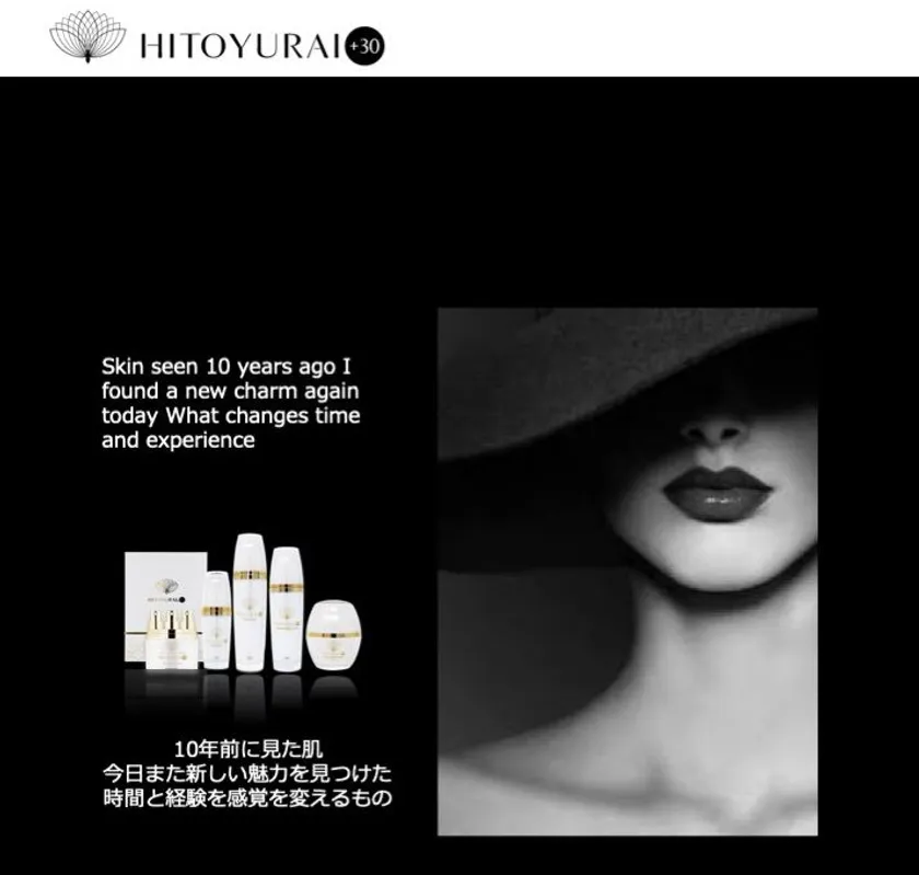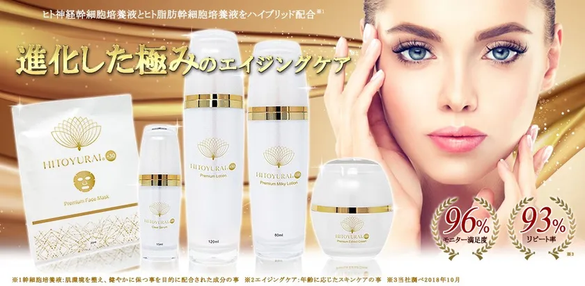 HITOYURAI+30は、再生医療として注目を集め最近の化粧品業界でも話題となっている、「幹細胞」に着目したオリジナルブランドです。業界的に世界初(当社調べ)の、ヒト脂肪幹細胞培養液とヒト神経幹細胞培養液をハイブリッドかつ脂肪幹細胞、神経幹細胞培養液、2種を合成させた原料を99パーセントもの高濃度で配合したオンリーワン技術を使い、メイド・イン・ジャパンの誇りをかけて開発した商品です。