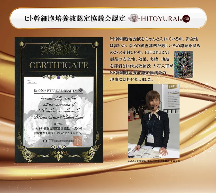 株式会社ETERNAL BEAUTY(代表取締役:大石 入耶、東京都新宿区)の主力商品である、国際特許取得デュアル幹細胞コスメ「HITOYURAI+30」は、日本トレンドマップ研究所によるシミやシワなどの肌ケア対策に関する市場調査において、30代~50代の女性が選ぶ3つのカテゴリでNO.1の評価をいただきました。