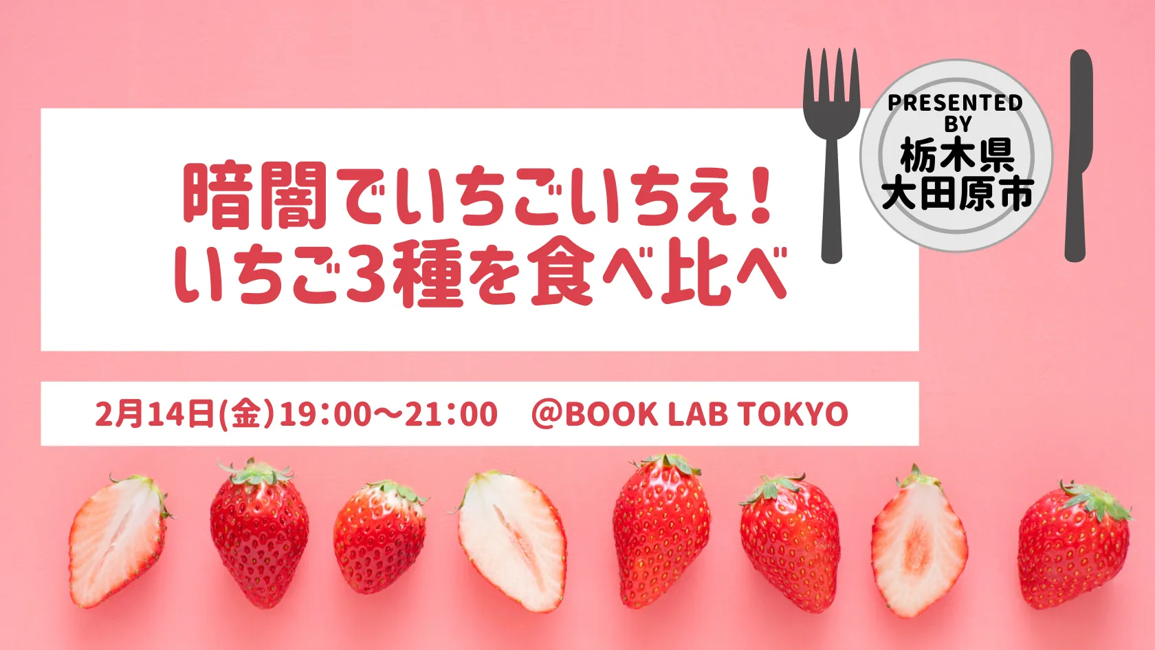 栃木県大田原市は、若者のUIJターンと移住を促進するためのプロジェクトの一つとして、大田原市と、大田原市で生産されているいちごを紹介するイベント『暗闇でいちごいちえ!いちご3種を食べ比べ presented by 栃木県大田原市』を、2020年2月14日(金)に東京都渋谷区のBOOK LAB TOKYOにて開催いたします。