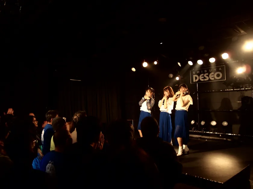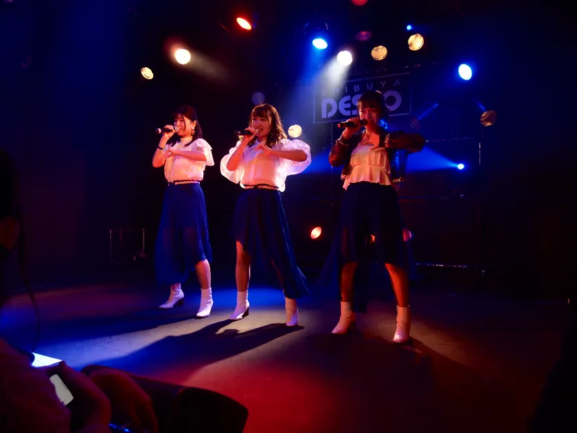 観客が盛り上げる中、青いスポットを浴びたステージには成田、宮凪、高橋が一人ずつ順番に登場。1曲目の『Heave-ho!(ヒーブホー)』では、ギターサウンドと軽快なドラムの音色が目立つコミカルなリズムに併せて、メンバーたちがフォーメーションをめまぐるしく変えながら舞い、撮影可能であった客席では、一瞬を逃すまいと意気込む観客たちが彼女たちの初ステージを熱心に記録していた。