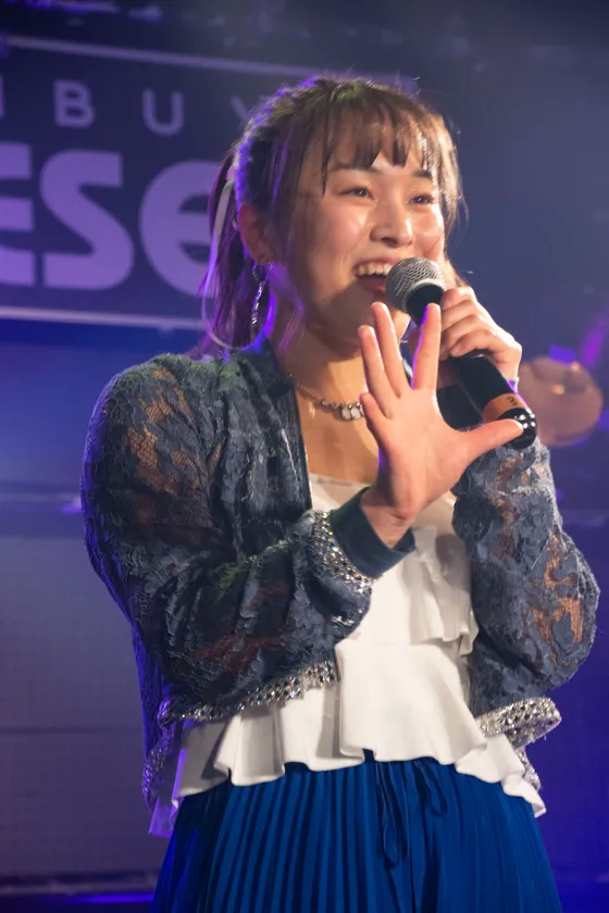 自己紹介となり「東京都出身。最年少。スカイブルーのさやちること成田彩です」と話し、「キャッチコピーがあり“彩り世界にようこそ!”と言ったら、みなさんも一緒にやってください!」と成田が促すと、客席も「ようこそ!」と合唱。宮凪も「岐阜県出身の宮凪華巳、メンバーカラーはオレンジです。好きなモノはポケモンのイーブイです」と続けた。