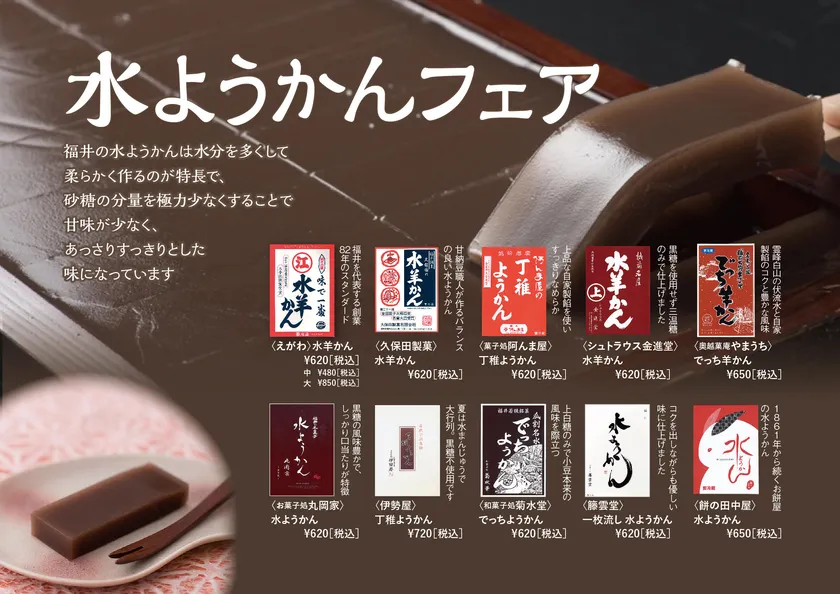福井県の冬の風物詩の水ようかんの魅力を堪能できる一カ月間。福井県内には多種多様な水ようかんがあり、それぞれのお店ごとに甘さ、色合い、固さ、パッケージにまでこだわった福井県の冬を代表する菓子です。フェアでは、福井県の老舗、人気店の福井定番の水ようかんだけでなく、フレンチレストラン監修「プレミアム水ようかん」、水ようかんに合う日本酒「水ようかん×日本酒」まで勢揃いします。また、青山店では福井の水ようかんの食べ比べが楽しめる「水ようかん3種食べ比べセット」を期間限定で販売します。