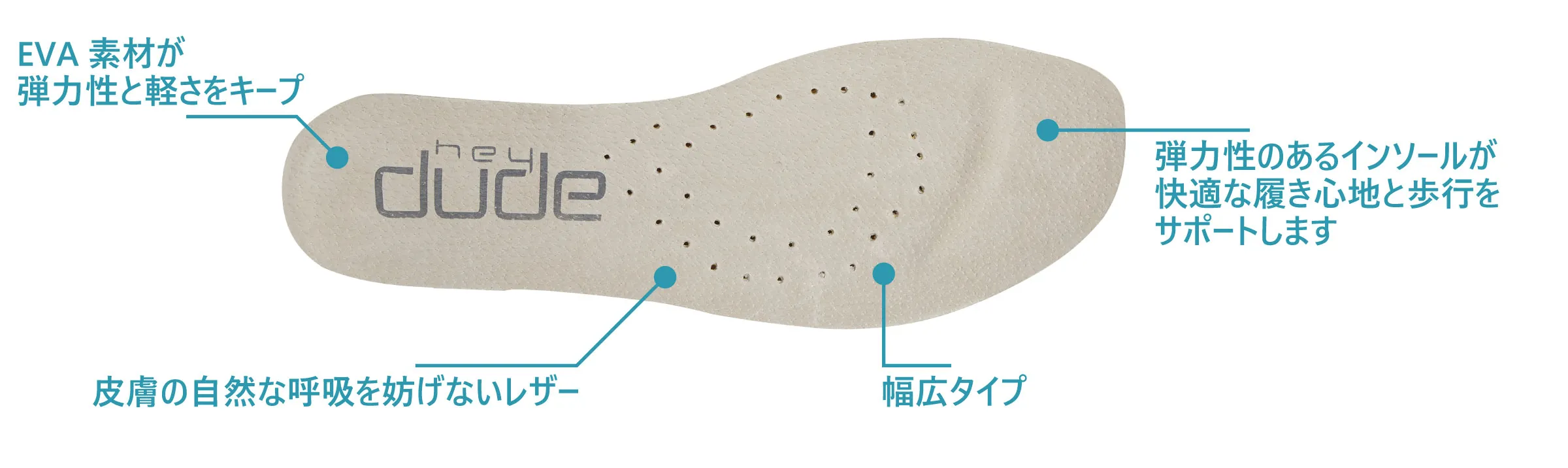 HEY DUDEの履き心地を実現するのが、このEVAソールです。取り外しも簡単で、超軽量、通気性、柔軟性が抜群な素材でできています。