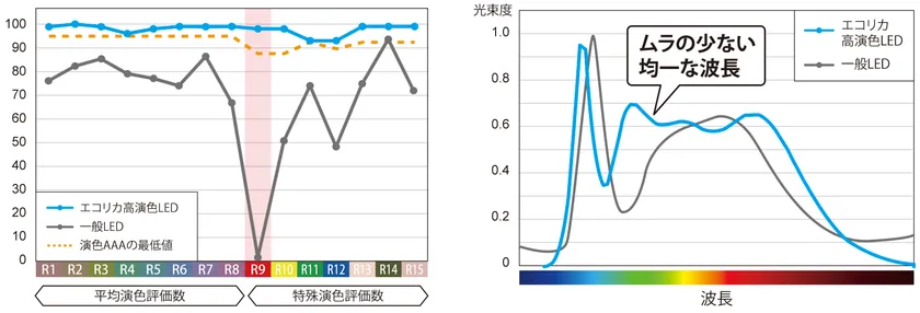 エコリカ高演色LEDと一般LEDの比較グラフ