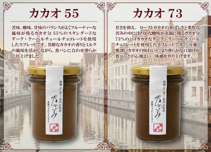 高級「生」食パン専門店「乃が美」から、カカオ分の異なる2種類のジャム(55%配合・73%配合)を2月1日(土)より販売開始いたします。どちらも乃が美のパンに合うように作られており、お好みの甘さを選んでいただけるようにとご用意いたしました。