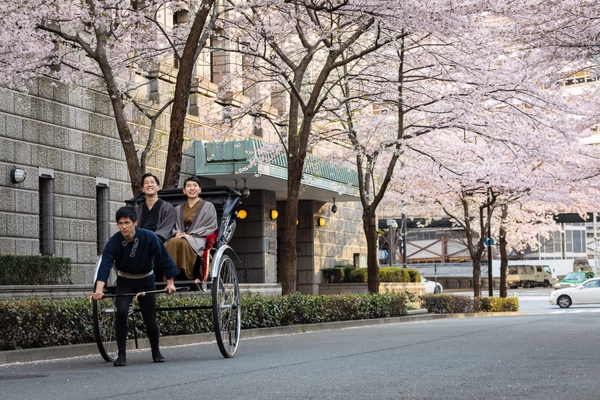 往路は、星のや東京から日本橋桟橋まで人力車で移動します。日本銀行などの歴史的建造物が建ち並ぶ「江戸桜通り」といった桜の見所を巡る片道約30分の道のりで、人力車の上から普段とは違った目線の高さで桜を眺めることができます。