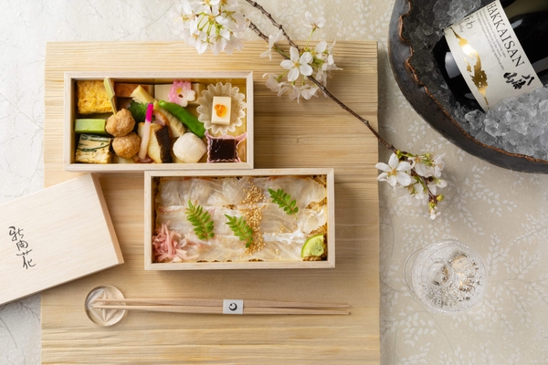 花見をしながら楽しめるように、夕食として神田明神下に店を構える老舗料亭「新開花」の花見弁当を提供します。ほんのりと桜色をした鯛の昆布〆と、黒酢を使った酢飯の入った弁当の軽やかな味わいに合わせて、口当たりの良いスパークリング日本酒を用意します。また、復路では点出しの抹茶とお茶菓子を提供します。