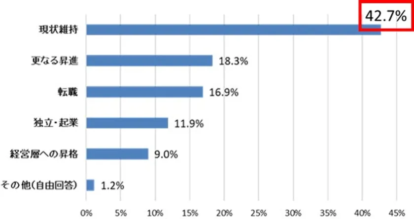 さらに、今後のキャリアプランについて、「現状維持」がトップ(42.7%)となり、リスクを避け安定を求める時代の世相に紐づく結果となりました。