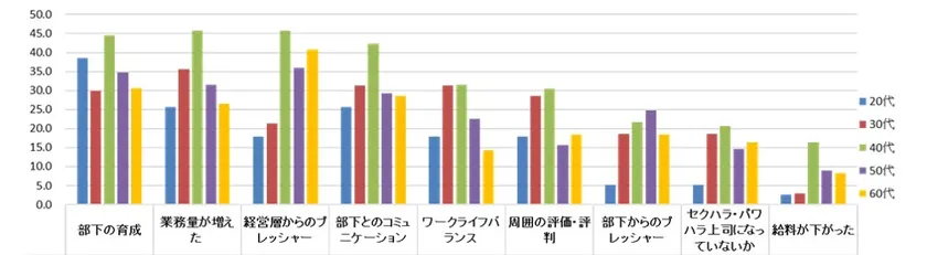 また、20代管理職は「年上部下との接し方」、終身雇用で育った世代は「ネクストエイジの教育」に悩む姿が、この結果から垣間見ることができます。