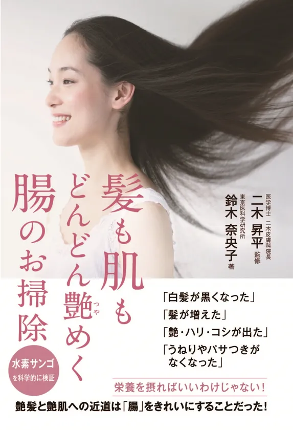 「水素育毛革命 決定版」(2017年 二木 昇平医師監修・鈴木 奈央子著 銀河書籍)で公開した抗酸化による育毛法に加え、本書では腸に関する最新の論文を盛り込み、腸の機能や腸内細菌の働きをより詳しく見ていくことで、腸内環境の改善がどのように艶髪・艶肌につながるのかを分かりやすく解説しています。さらに、老化現象は細胞の減少や劣化によるものだという点にも着目し、肌や頭皮や腸内の細胞代謝の重要性もお伝えする内容です。健康美容を手に入れるための腸のお掃除、これを助けてくれるという食品原料「水素焼成サンゴ末」に注目。その根拠となる抗酸化力や腸内環境改善力のエビデンスをご紹介しています。体の内側から健康になりながら艶髪・艶肌へと導くプロセスを図解で解説するとともに、この艶髪・艶肌修復ステップにより、薄毛や白髪、美容師の手荒れが改善されたという貴重な実例写真も多数収録しています。