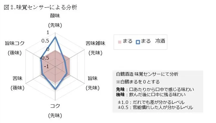 夏場に日本酒を冷やして楽しむ文化が広がりを見せていることから、冷旨酸(リンゴ酸・クエン酸・酢酸)を多く含む、冷やして美味しい酒質に仕上げました(図1.)。すっきりした爽やかな酸味ときりっとした味わいが楽しめます(図2.)。酢の物など酸味のある料理や枝豆など塩味のある料理、アジフライなど脂っこい料理とも好相性です。