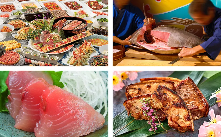 写真左上から時計回りに:バイキングイメージ、まぐろ祭りよりまぐろ解体ショー、まぐろカマステーキイメージ、生まぐろ刺身イメージ
