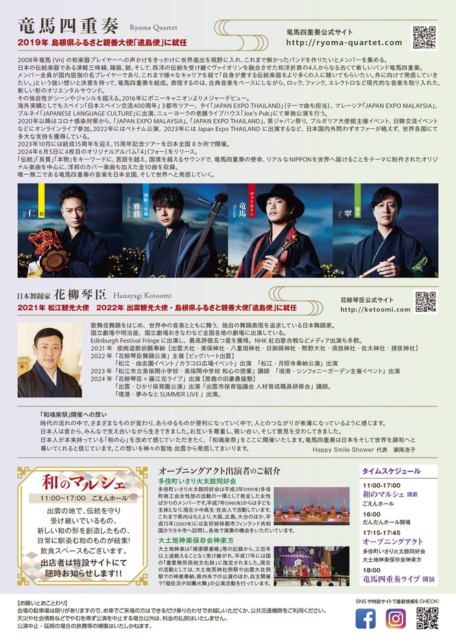 古代神話の息づく出雲の地でまるまる1日、日本の「和ごころ」を感じるマルシェやライブを開催! 和をテーマにした地元の企業や店舗が出店する「和のマルシェ」では、日本の心に触れ、和の心を育む体験を! ライブのオープニングでは地元の子どもたちが太鼓や神楽などの伝統芸能を披露します。メインイベントの「竜馬四重奏ライブ」では洋の伝統楽器ヴァイオリンと日本の伝統楽器、鼓・篠笛・津軽三味線、日本舞踊の絶妙な共鳴で心震える体験をお楽しみください!