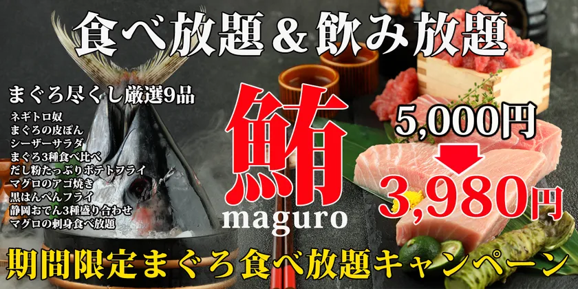2月は「まぐろ刺し食べ放題&飲み放題キャンペーン」を開催!! まぐろ刺し食べ放題+まぐろ尽くし厳選9品のお料理 +飲み放題付き3,980円!!