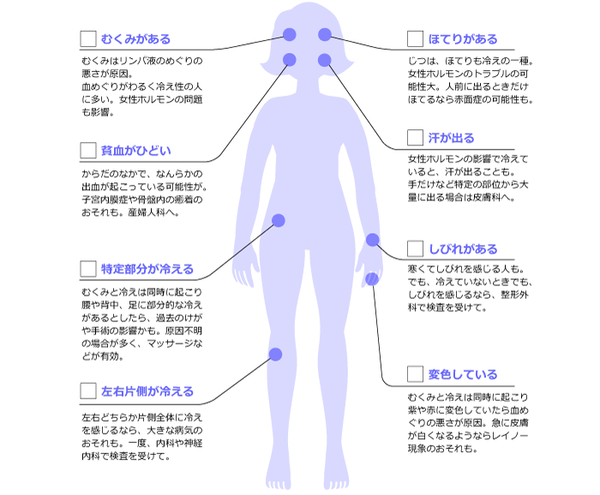 また、単なる冷え性だと思っていたら、膠原病や甲状腺などの病気の場合もあります。長く続くようなら注意して、婦人科や内科を受診しましょう。