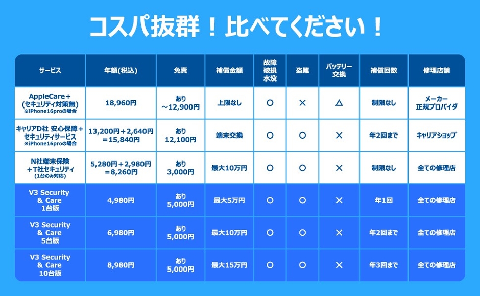 - 破損(画面割れ等)・水濡れ(水没)・故障・盗難などの物理的トラブルに対応
