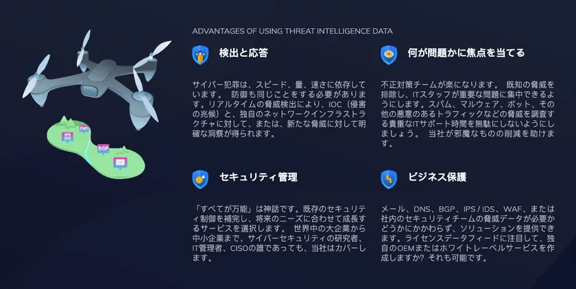 現在、政府機関、医療提供者、および教育機関は様々なサイバー脅威を受けています。2019年10月1日~2019年12月31日のJPCERT/CCインシデント報告対応レポートによりますと、本四半期に寄せられた報告件数は、5,189件でした。このうち、JPCERT/CCが国内外の関連するサイトとの調整を行った件数は3,525件でした。前四半期と比較して、報告件数は12%増加し、調整件数は15%減少しました。C2ボット通信、フィッシング、ランサムウェアは非常に破壊的であるため、あらゆるビジネスに壊滅的な被害をもたらします。今後も企業は、知的財産、顧客データ、内部文書などの将来の保護のための投資を含む将来の事業計画にサイバーセキュリティを統合する必要があります。こうした結果をうけ、企業は今後サイバー脅威からビジネスを監視、検出、保護するニーズが高まることが予想されることから、今回インシデント監視、検出、保護の対策そしてリアルタイム脅威データに特化したWebサイトを立ち上げることとなりました。