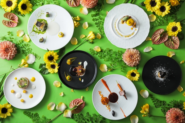 冷前菜は、旬の鹿児島県産カンパチとイエローパプリカを、レモングラス香るトマトジュレで味わうさっぱりとした一品に、温前菜にはオマール海老、熟したマンゴーの甘み、ココナッツミルクのアンサンブルが楽しめる一品をご用意。メインは、鹿児島県産黒豚を、香り高いオレンジリキュールでフランベしたフレッシュオレンジと共にご提供。“薩摩富士ふもとのひまわり畑”を表現したフルコースをご堪能いただけます。
