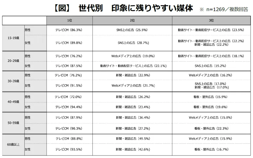 「テレビCM」が全世代で「印象に残りやすい媒体」と最も多くの回答を得ました。次いで全体では「新聞・雑誌広告」が2位でしたが、15〜29歳では「SNSサイト上の広告」と「動画広告」を選んだ人が多い結果となりました。