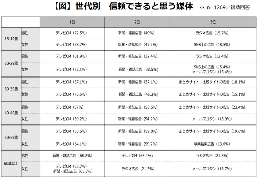 信頼できると思う媒体として最も回答数が多かったのは「テレビCM」、次いで「新聞・雑誌広告」という結果になりました。購買意欲や印象に関する設問に比べて「新聞・雑誌広告」を選択した方の割合が多く、また60歳以降のシニア層では「新聞・雑誌広告」が首位になるなど、「新聞・雑誌広告」が消費者から信頼性の高い媒体として認識されている状況がうかがえました。