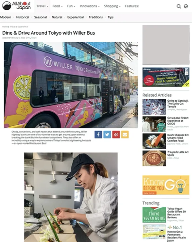 第一弾の取り組みとして、WILLER株式会社(本社:大阪府大阪市、代表取締役:村瀬 茂高)が企画・開発を行った「観光」と「食」が融合した日本初のレストランバス「WILLERレストランバス」の魅力をそれぞれのサイトにて紹介しています。「Wanderlist Japan」では、1分の短尺動画で容易に理解してもらえるような内容にすることで拡散を狙い、「All About Japan」では、詳細な説明を加えた記事形式にすることでより深く理解を促します。これによって、多くの訪日外国人に対して認知獲得と態度変容の両方を可能にします。