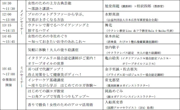 「チアフルゼミ スペシャル」は、メインセミナー・ミニセミナー合計10の講座を用意しており、ご自分の好みのセミナーを選んで受講いただけます。両社がコラボレーションすることにより、様々なテーマのセミナーを、より多くの女性に気軽にお楽しみいただきます。