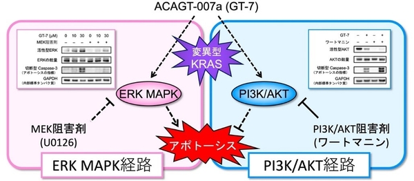 (ERK MAPKシグナル調節薬であるACAGT-007aは、AKTシグナル阻害剤と併用することにより、KRAS変異を持つ膵臓がん細胞に対して細胞死を誘導する)