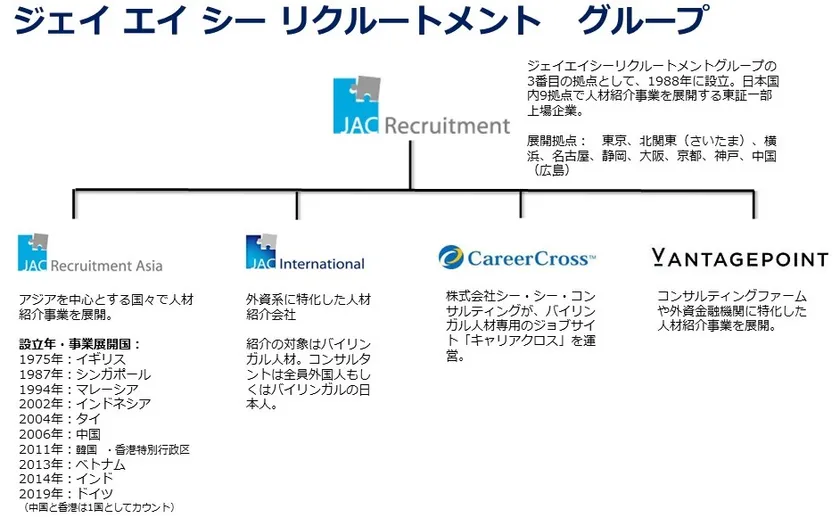 1975年にイギリスで設立されたジェイ エイ シー リクルートメントの3番目の拠点として日本で1988年に事業を開始。スペシャリストや管理職の人材紹介に特化した、国内最大規模の東証一部上場企業です。国際ビジネス経験をもつ人材の紹介も強みの一つで、日本国内では外資系企業や日系企業の海外事業などのグローバル人材領域の売上が全体の50%以上を占めています。外資系企業の人材紹介に特化したJAC International、ジョブサイトの「キャリアクロス」を運営するシー・シー・コンサルティング、英国、ドイツおよびアジア8ヵ国で人材紹介業を展開するJAC Recruitment Asia Ltdのグループ会社を傘下に、世界11ヵ国、25拠点で事業を展開するグローバル企業です。