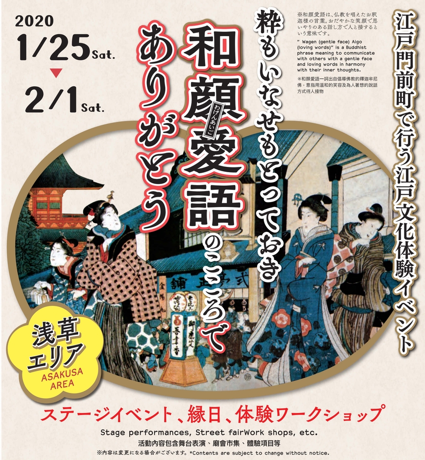 和顔愛語とは、おだやかな笑顔と思いやりのある話し方で人と接するという意味の仏教を唱えたお釈迦様の言葉です。本イベントは、その言葉が息づく浅草、築地の東京を代表する門前町で江戸文化を体験できる無料イベントです。