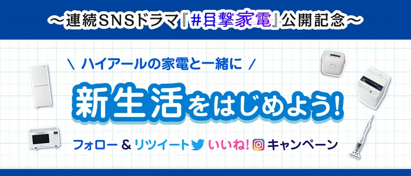 ハイアールジャパンセールス株式会社(本社:大阪市、代表取締役社長:杜 鏡国)は、家電と一緒に見守る新感覚の“連続SNSドラマ”「#目撃家電」をハイアールジャパン公式Twitter/公式Instagram/特設サイトにて、1月31日(金)より公開いたしました。同時に、公開を記念して、ハイアールの新生活家電やオリジナルノベルティグッズが当たるプレゼントキャンペーンを開始いたしました。