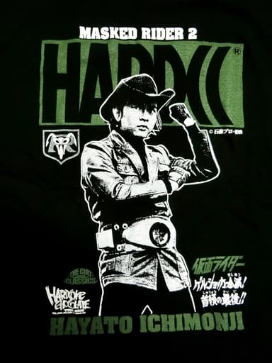 ハードコアチョコレート×仮面ライダーで実現した一文字隼人Tシャツは、クラッシックスタイルな緑のカラーリング。