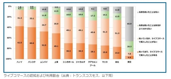 「ライブコマース」認知度・利用経験とも東京が最下位――トランスコスモスがアジア10都市で調査