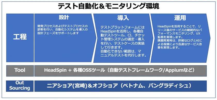 本サービスでは、米国HeadSpin社の「テストプラットフォーム」と「オープンソースの各種テスト自動化ツール」を組み合わせて、モバイル端末等の実機によるリモートテストと継続的なパフォーマンス/UXモニタリングを実現します。今後はモバイル端末のみではなく、PCブラウザや各種組み込み機器もHeadSpinがサポート対象を拡充・個別対応する予定であり、適用システムをWebシステム、モバイル、IoT、5G関連の分野への拡張を目指します。