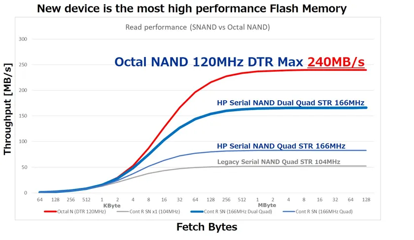 1GビットのW35N01JWはオクタル・インターフェースを持つ世界初のNAND製品です。連続読出しスループットは最大240Mバイト/秒であり、既存の高性能シリアルNANDフラッシュメモリ/W25N-JWファミリの3倍高速です。 また、デュアル・クワッド・シリアルNANDフラッシュメモリ/W72N-JWファミリよりも1.5倍高速です。