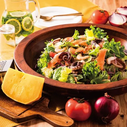 ロメインレタスとその時期のおいしい素材を組み合わせた、目の前で仕上げるサラダ。削りたてチーズで風味豊かな味わいに。