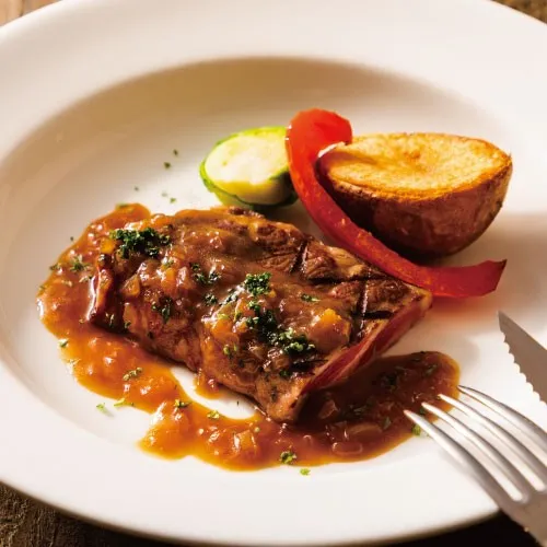 牛肉をグリルし、玉ねぎの甘みを感じられるシャリアピンソースで仕上げました。牛肉の旨味をシンプルに味わえます。