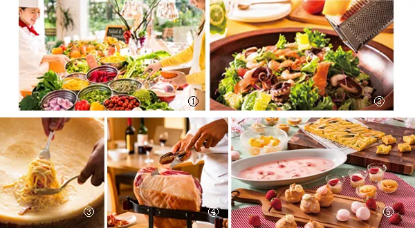 また、ディナー限定で注文を受けてからご用意する「ホールチーズで仕上げるカルボナーラ」(画像3)や、切りたてを何度でも楽しめる「生ハム」(画像4)も食べ放題!