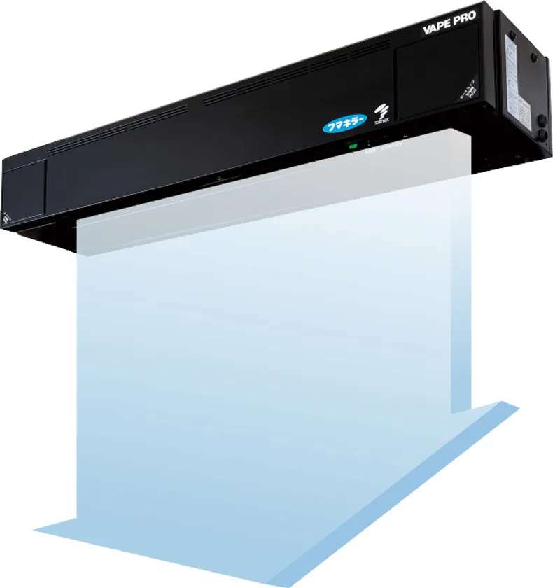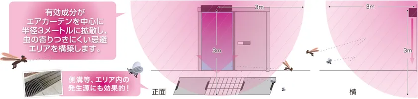 防虫エアカーテンは、虫を寄せ付けない効果を持つフマキラー株式会社のウルトラベープPROの忌避成分がエアカーテンを中心に半径3mの忌避エリアをつくるのと同時に、エアカーテン気流により侵入経路であるドア開口部に行き渡り、工場や店舗への虫の侵入自体を防ぐことを目的とします。