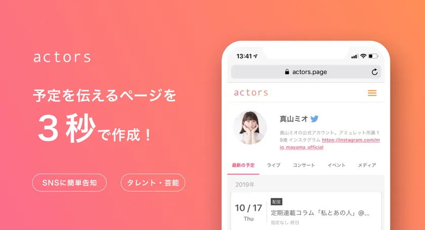 UXデザインカンパニーの株式会社アジケ(本社:東京都目黒区、代表取締役:梅本 周作)は、芸能やタレント、YouTuber活動等に伴う“予定情報”の共有に便利なWebアプリ「actors(アクターズ)」(公式URL: https://actors.page )を2月6日に正式リリースいたしました。