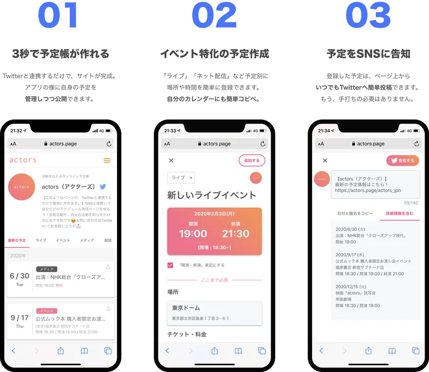 お手持ちのTwitterアカウントと連動して、3秒で予定ページを作成。