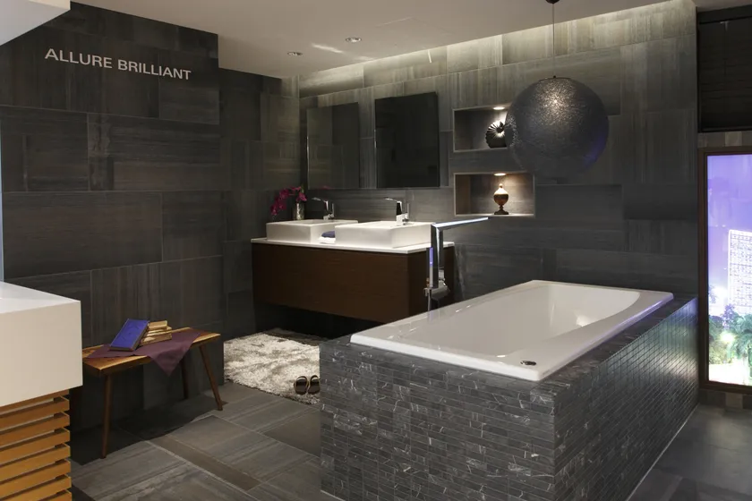 様々なスタイルやカラーバリエーションの洗面水栓と、繊細なディティールと輝きが美しい浴室水栓を展示。水まわりにおけるインテリアのひとつとして洗練さを演出します。