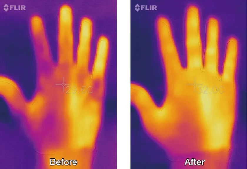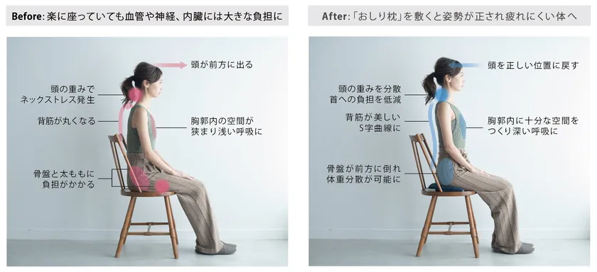 「おしり枕」はおしりの下に敷くだけで崩れた姿勢を正す力、その姿勢をキープする力を発揮し、姿勢を正すことで、胸郭に十分な空間を作り、正常に呼吸ができるようにします。さらに、横隔膜の運動により、内臓へのポンプ機能と胸郭部のポンプ機能を高めることで全身へ血を送る機能がアップし、血行を促進することで肩こりや腰痛など体の不調を改善へと導くことができます。