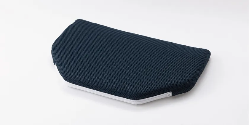 「おしり枕」を開発するにあたり、企画段階から椅子に置くことを想定し、どんな椅子にも機能が発揮できる形状を模索した結果、台形のような六角形に至りました。丸い座面の椅子にも、四角い座面の椅子でも合わせて使うことが可能です。