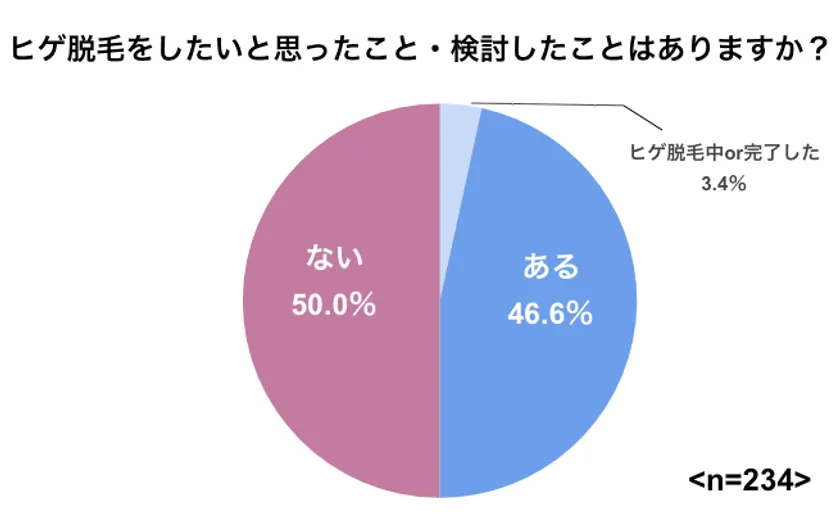 まず、「ヒゲ脱毛をしたいと思ったことはありますか?」という質問では、「ある」「脱毛中・脱毛済み」と答えた人が50%、「ない」と答えた人が50%と半々の結果になりました。