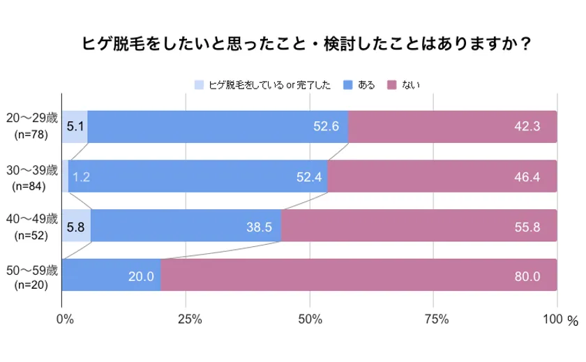 このデータを年代別に見てみると、若い世代ほどヒゲ脱毛への関心度が高いことがわかります。20代は「ある」「脱毛中」の回答者が合わせて57.7%と最も多く、年代が上がるにつれてその割合は下がりました。