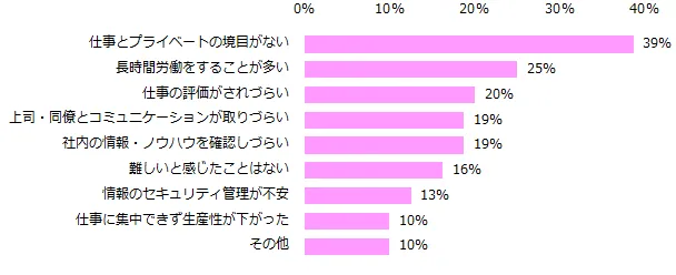 テレワーク経験者に、テレワークの難しさを伺うと、第1位は「仕事とプライベートの境目がない」(39%)でした。次いで、「長時間労働をすることが多い」(25%)、「仕事の評価がされづらい」(20%)でした。テレワークで仕事を進める上で工夫したこともご紹介します。
