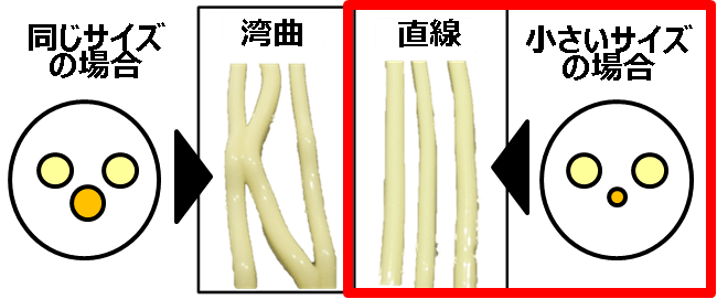 3つの絞り口の中でも中央の絞り口を小さくしています。これにより、湾曲した線の発生を防いでいます。